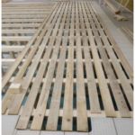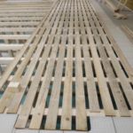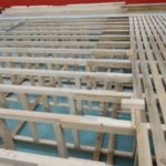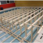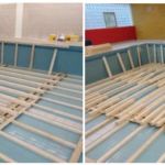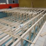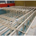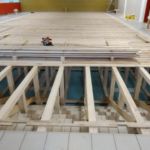 Auf mehr als 250 Stützen aus Konstruktionsholz wurde das Schwimmbecken mit nebeneinander liegenden Tragbalken aufgefüllt, durch Bretter verstärkt und auf Höhe des Beckenrands angehoben.
