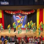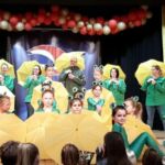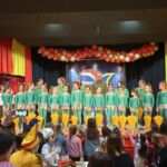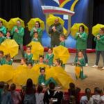 Die Mädels, im grünen Froschkostüm, die Eltern im Regenmantel, schwangen mit elegantem Schwung, kleine gelbe Schirme und zauberten somit ein schönes Farbenspiel auf die Bühne.